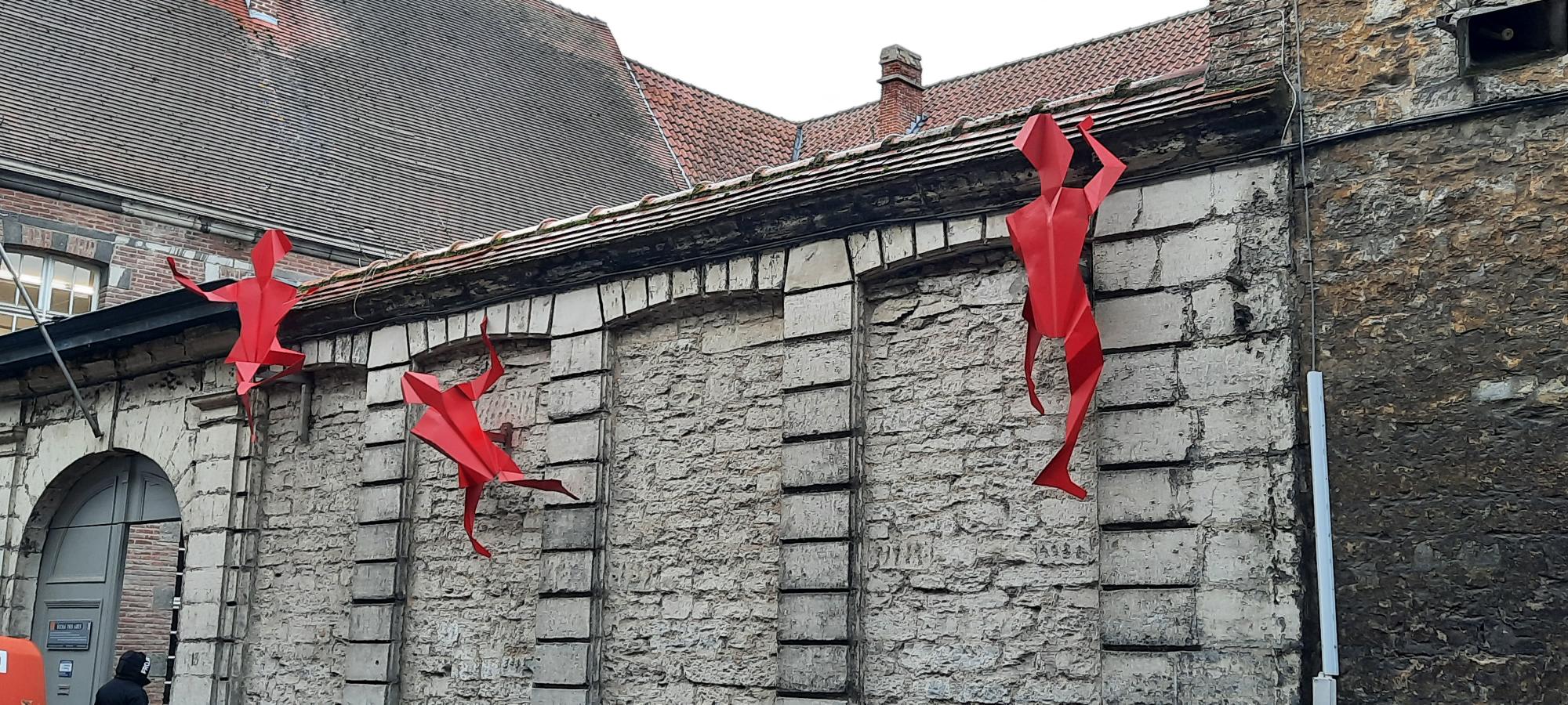 Le parcours design de Tournai s’enrichit avec l'installation de trois pantins sur la façade de l'École des Arts.