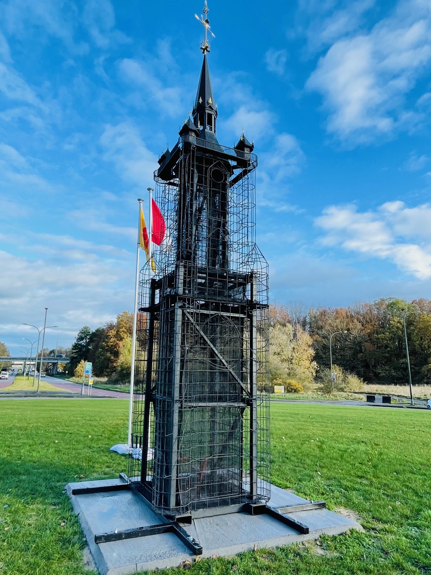 Ce vendredi 17 novembre 2023, la Ville de Tournai et son Bourgmestre ont inauguré une œuvre d’art dans le giratoire dit de « TOURNAI EXPO », situé sur la RN48, plus prosaïquement appelée chaussée de Renaix, à proximité de la montée d’autoroute E42, à la limite de Kain et de Rumillies. La Ville de Tournai a acquis une très belle structure métallique représentant le Beffroi. Cet objet avait été réalisé par le service des espaces verts de la Province de Hainaut et posé sur la Grand-Place de Tournai durant l’été 2018. Cette mosaïculture avait remporté un beau succès auprès de la population.